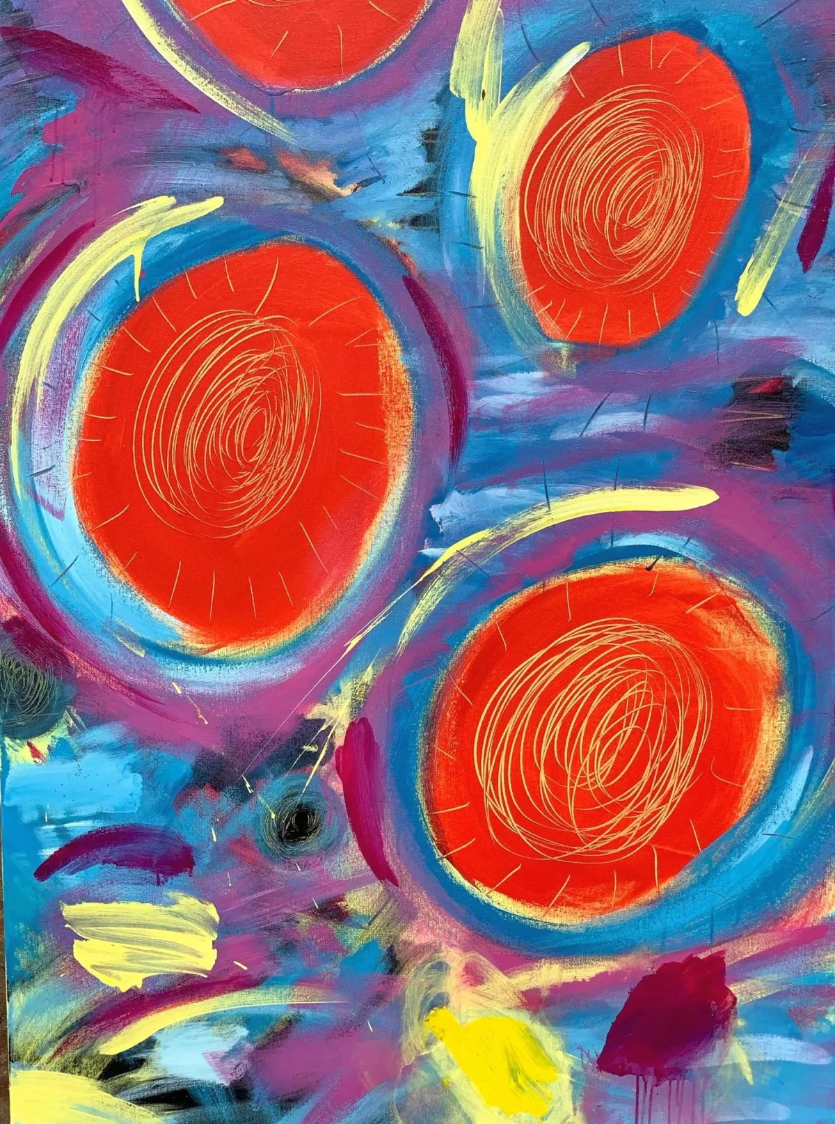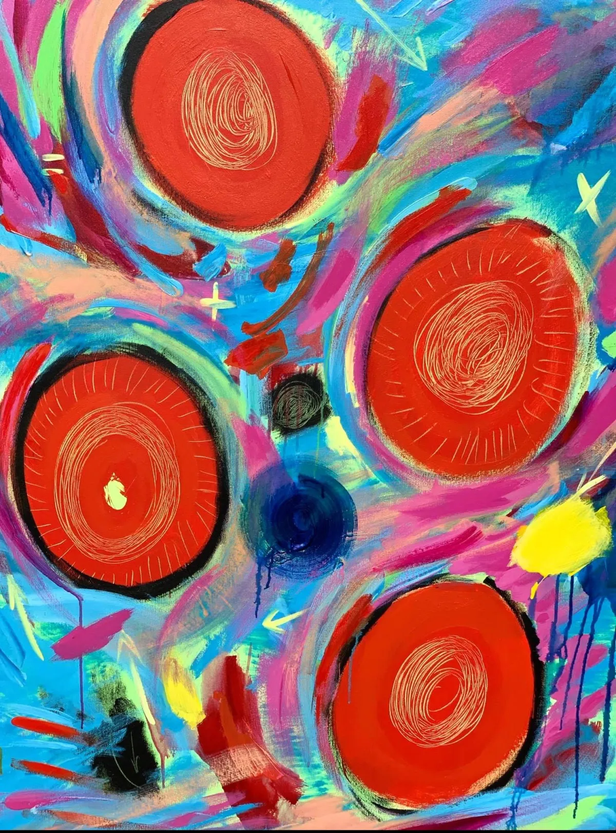 She started to dance during her painting sessions. And this di d the trick completely: it sort o switched off this critical voice so paralysing. She stopped thinking. Just allowed herself to feel and trust herself, trust her feelings and impulsions to create the paintings.